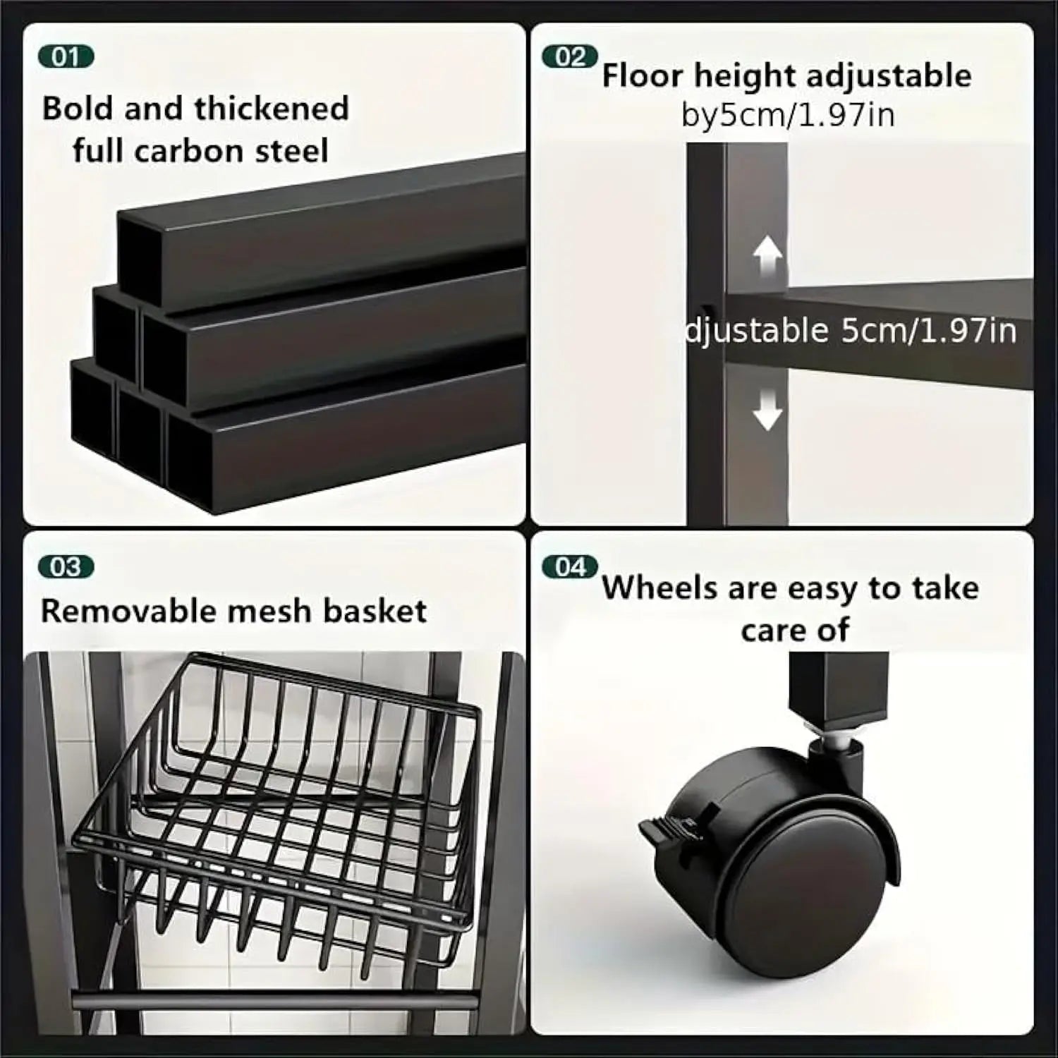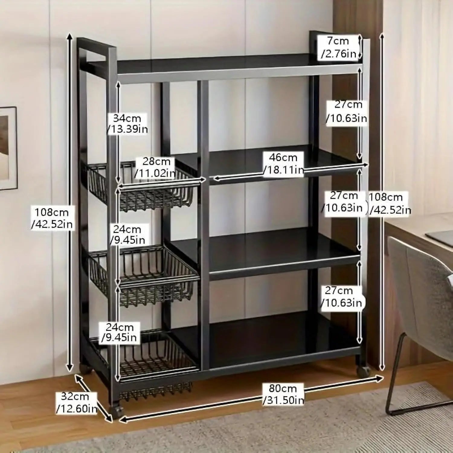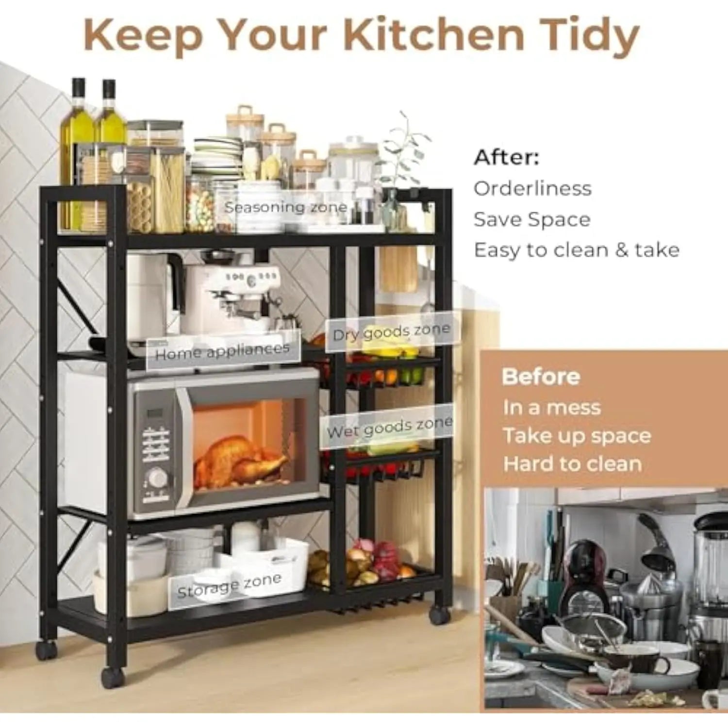A90 Adjustable 4-Tier Kitchen Shelf with 3 Metal Baskets, Kitchen Organizer and Storage Rack,
